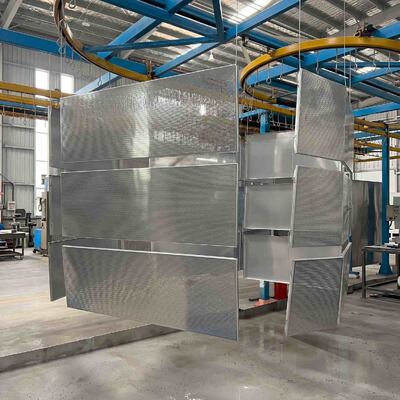 Một hệ thống băng tải treo tải nặng liên tục vận chuyển các tấm kim loại lớn qua dây chuyền sơn tĩnh điện và sấy công nghiệp tự động.