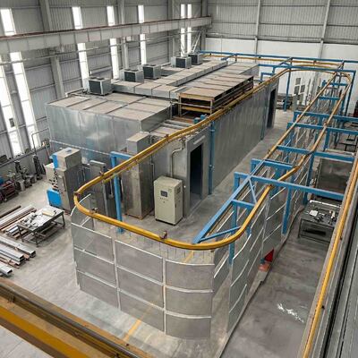 Hệ thống xử lý vật liệu trên cao công nghiệp dẫn các bộ phận kim loại qua một lớp phủ bột sạch và cơ sở sản xuất.